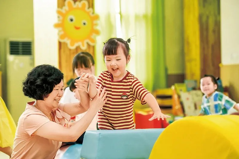 近年来,各地着力解决3岁以下婴幼儿家庭入托难、入托贵等问题,大力发展完善普惠托育服务体系,不断增强人民群众对普惠托育服务的获得感和满意度,促进婴幼儿健康成长。图为2024年9月4日,江西省奉新县示范幼儿园托育班的老师和孩子们在快乐地玩耍。人民图片 周亮/摄